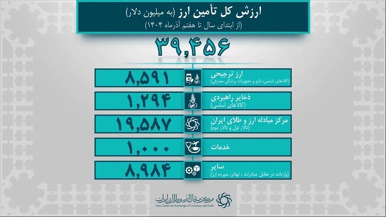 به گزارش پایگاه خبری «عصر بازار» به نقل از ایبنا، از ابتدای سال جاری تا هفتم آذرماه، 39 میلیارد و 456 میلیون دلار ارز برای واردات انواع کالاهای اساسی، دارو، محصولات صنعتی و خدمات توسط بانک مرکزی تامین شده است.