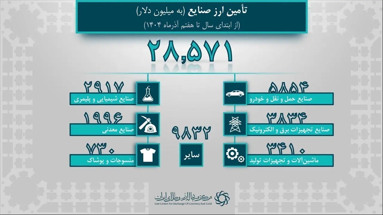 ارزش کل ارز تأمینشده برای «صنایع تجهیزات برق و الکترونیک» و «ماشینآلات و تجهیزات تولید» به ترتیب بیش از 3.8 و 3.4 میلیارد دلار بوده و «صنایع شیمیایی و پلیمری» و «صنایع معدنی» نیز به ترتیب بیش از 2.9 و 2 میلیارد دلار دریافت کردهاند.