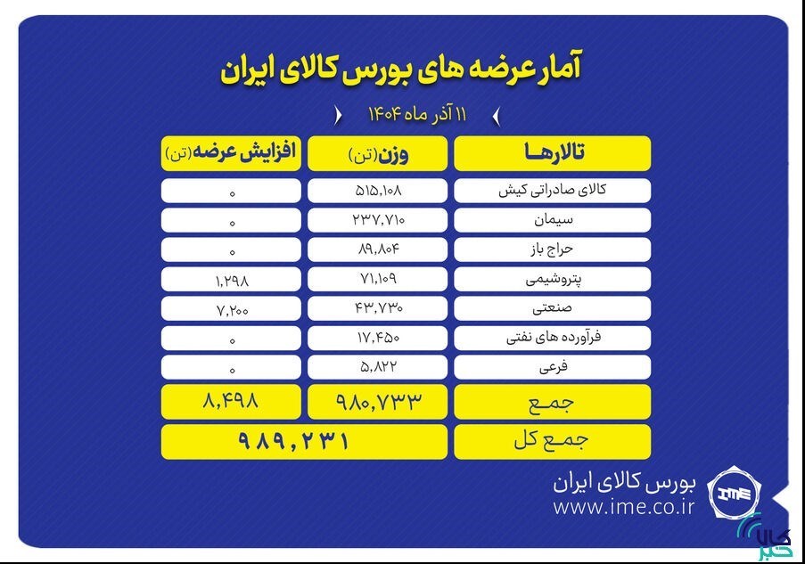 عصر بازار- تالارهای بورس کالای ایران امروز سه‌شنبه ۱۱ آذر ماه میزبان عرضه ۹۸۹ هزار و ۲۳۱ تن انواع محصول است.