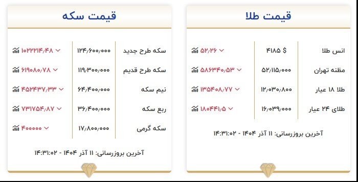 به گزارش پایگاه خبری «عصربازار» به نقل از ایرنا، اتحادیه طلا و جواهر تهران بهای هر اونس طلا را برای معاملات روز سه شنبه ( 11 آذرماه) چهار هزار و 185 دلار اعلام کرد که نسبت به روز گذشته، 52 دلار کاهش داشت و در کنار آن کاهش بهای ارزهای عمده در بازار غیررسمی، نرخ ها را به سمت کاهش سوق داد و قیمت انواع مسکوکات و مصنوعات طلا در بازار تهران را نزولی کرد.