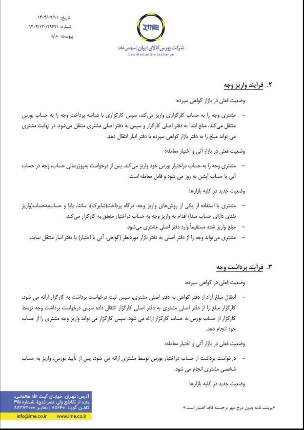 • برداشت وجه از هر بازار ابتدا به دفتر اصلی مشتری منتقل میشود (با تأیید بورس).