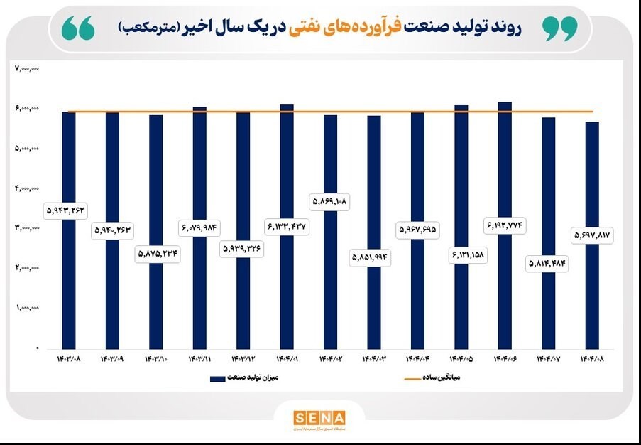دادههای آماری این گزارش حاکی از آن است که میزان تولید صنعت فرآوردههای نفتی از 5 میلیون و 943 هزار و 262 مترمکعب در آبان 1403 به 5 میلیون و 697هزار و 817 متر مکعب در آبان امسال رسیده است. تولید این صنعت در یک سال گذشته با افت 4 درصدی روبرو شده است.