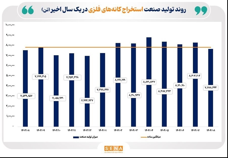 میزان تولید صنعت استخراج کانههای فلزی از 7 میلیون و 549 هزار و 857 تن در آبان پارسال به 7 میلیون و 688 هزار و 442 تن در آبان امسال رسیده است.