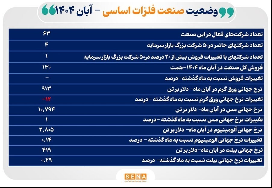 بر اساس این گزارش در آبان امسال مجموع فروش شرکتهای فعال در فلزات اساسی به 130 همت رسید که نسبت به مهر تغییری نداشته است.