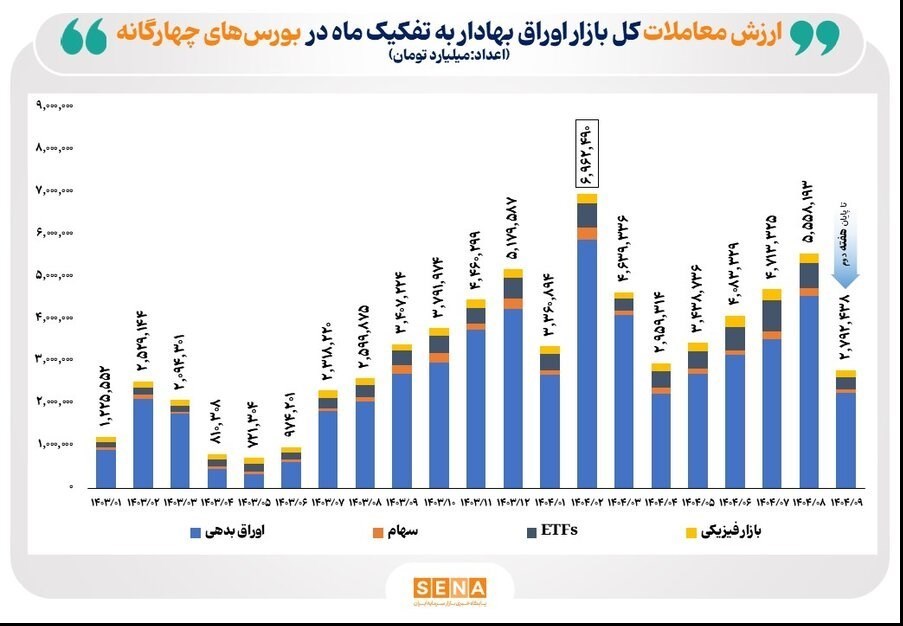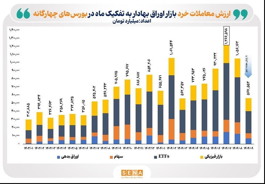 از سوی دیگر بیشترین ارزش معاملات خرد ماهانه در مهر 1404 به ثبت رسید. در این ماه ارزش معاملات خرد به یک میلیون و 266 هزار و 598 میلیارد تومان رسید.