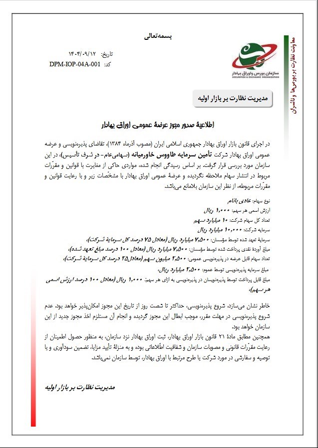 به گزارش پایگاه خبری «عصر بازار» به نقل از سنا، مدیریت نظارت بر بازار اولیه با انتشار اطلاعیهای در سامانه کدال اعلام کرد که مجوز عرضه عمومی اوراق بهادار شرکت تأمین سرمایه طاووس خاورمیانه (سهامی عام – در شرف تاسیس) صادر شده است.