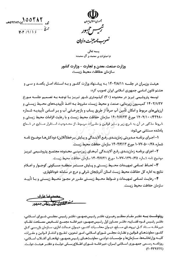 به گزارش پایگاه خبری «عصر بازار» به نقل از سنا، تصویب نامه مصوب جلسه 11 آبان ماه 1404 هیات وزیران در خصوص «مستثنی شدن توسعه پتروشیمی تبریز از محدودیتهای استقرار صنایع» روز گشته 16 آذر 1404، توسط معاون اول رئیس جمهور ابلاغ شد.