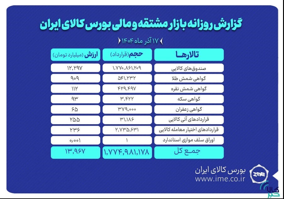 همچنین در معاملات روز گذشته بازار مشتقه و مالی، یک میلیارد و 770 میلیون و 861 هزار و 209 واحد صندوق کالایی به ارزش 12 هزار و 297 میلیارد تومان دست به دست شد.