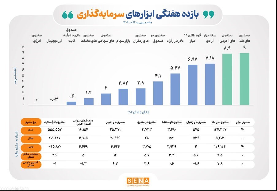 عصر بازار- طبق اطلاعات و دادههای مرکز نظارت بر صندوقهای سرمایهگذاری سازمان بورس و اوراق بهادار، در بازه زمانی ۶ تا ۱۲ آذر۱۴۰۴، بازده ۸ ابزارهای سرمایهگذاری بورس مثبت بوده است.