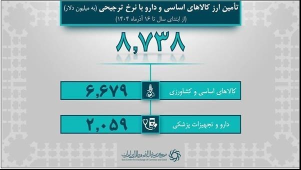 به گزارش پایگاه خبری «عصر بازار» به نقل از روابط عمومی بانک مرکزی، از این میزان 8 میلیارد و 738 میلیون دلار به واردات کالاهای اساسی و دارو شامل 6 میلیارد و 679 میلیون دلار برای نهاده‌ها و بخش کشاورزی و 2 میلیارد و 59 میلیون دلار برای واردات دارو و تجهیزات پزشکی تخصیص یافته است.