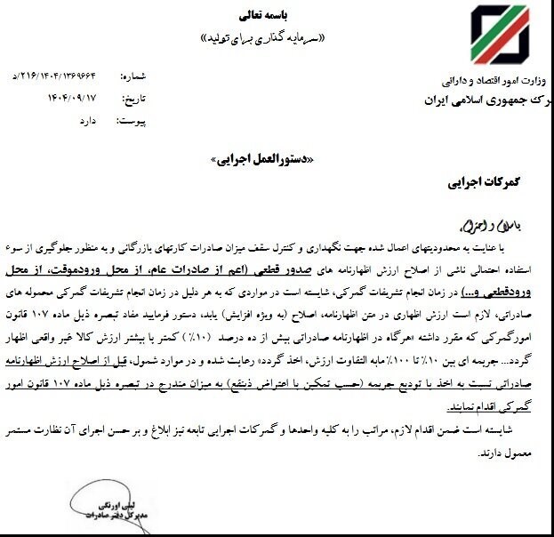 در این بخشنامه آمده است: با عنایت به محدودیتهای اعمال شده جهت نگهداری و کنترل سقف میزان صادرات کارتهای بازرگانی و به منظور جلوگیری از سو استفاده احتمالی ناشی از اصلاح ارزش اظهارنامههای صدور قطعی (اعم از صادرات، عام از محل ورود موقت، از محل ورود قطعی و....) در زمان انجام تشریفات گمرکی، شایسته است در مواردی که به هر دلیل در زمان انجام تشریفات گمرکی محمولههای صادراتی لازم است ارزش اظهاری در متن، اظهارنامه اصلاح به ویژه افزایش یابد، دستور فرمائید مفاد تبصره ذیل ماده 107 قانون امور گمرکی که مقرر داشته «هر گاه در اظهارنامه صادراتی بیش از ده درصد (10٪) کمتر یا بیشتر ارزش کالا غیر واقعی اظهار گردد… جریمهای بین 10 تا 100% مابهالتفاوت ارزش اخذ گردد»، رعایت شده و در موارد شمول قبل از اصلاح ارزش اظهارنامه صادراتی نسبت به اخذ با تودیع جریمه (حسب تمکین با اعتراض ذینفع) به میزان مندرج در تبصره ذیل ماده 107 قانون امور گمرکی اقدام نمایند.