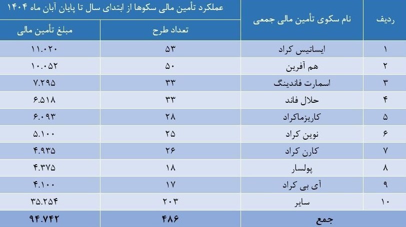 گزارش آماری مدیریت پژوهش سازمان بورس از عملکرد سکوهای تأمین مالی جمعی از ابتدای امسال تا پایان آبان گویای این است که سکوهای «ایساتیسکراد، همآفرین و اسمارت فاندینگ» به ترتیب با 1،102 برای 53 طرح، 1،005 برای 50 طرح و 729 میلیارد تومان برای 33 طرح رتبههای اول تا سوم را از حیث ارزش تامین مالی داشتهاند.