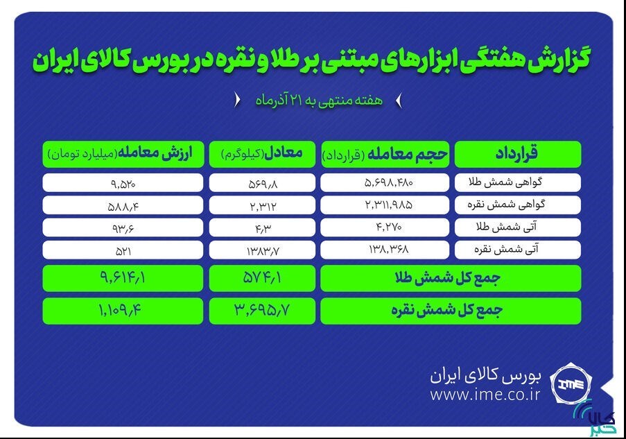 عصر بازار- بررسی عملکرد ابزارهای مبتنی بر طلا و نقره در بورس کالای ایران نشان میدهد که در هفته گذشته حدود ۳ تن و ۶۹۶ کیلوگرم شمش نقره و ۵۷۴ کیلوگرم شمش طلا در بازار گواهی سپرده و آتی معامله شد.