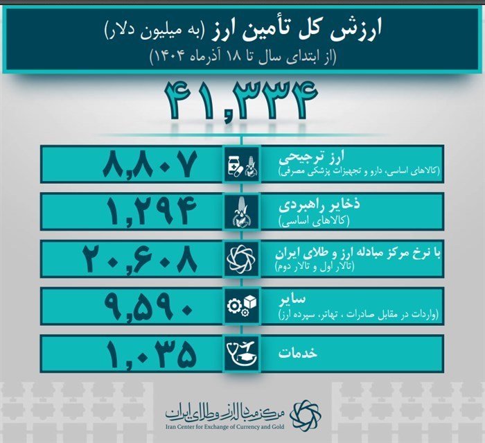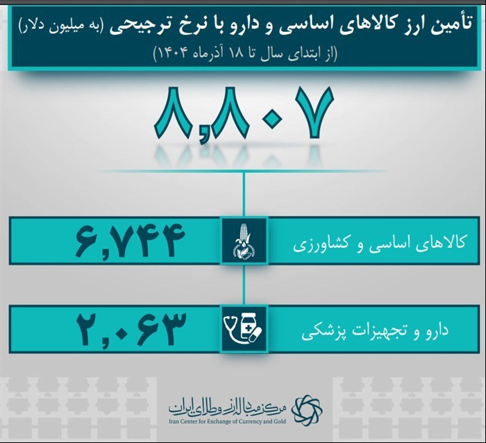به گزارش پایگاه خبری «عصر بازار» به نقل از روابط عمومی بانک مرکزی از این میزان، 8 میلیارد و 807 میلیون دلار به واردات کالاهای اساسی و دارو شامل 6 میلیارد و 744 میلیون دلار برای نهادهها و بخش کشاورزی و 2 میلیارد و 63 میلیون دلار برای واردات دارو و تجهیزات پزشکی تخصیص یافته است.