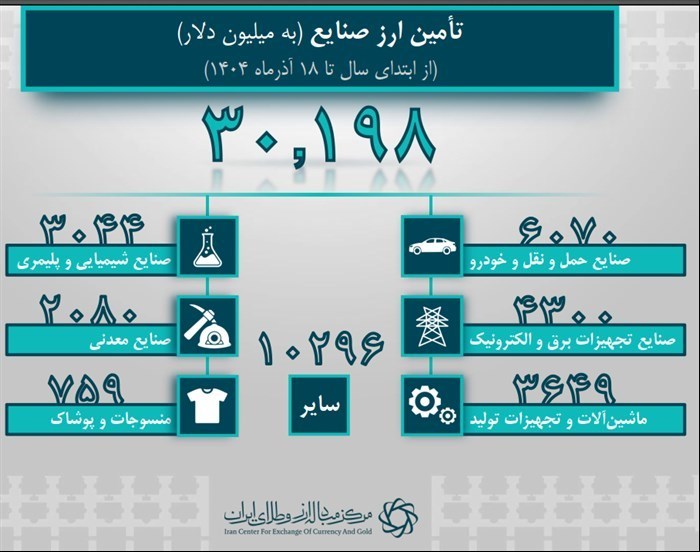 عصر بازار- از ابتدای سال جاری تا ۱۸ آذرماه در مجموع ۴۱ میلیارد و ۳۳۴ میلیون دلار برای نیازهای مختلف وارداتی کشور توسط بانک مرکزی تأمین ارز انجام شده است که بیش از ۳۰ میلیارد دلار مربوط به صنایع است.