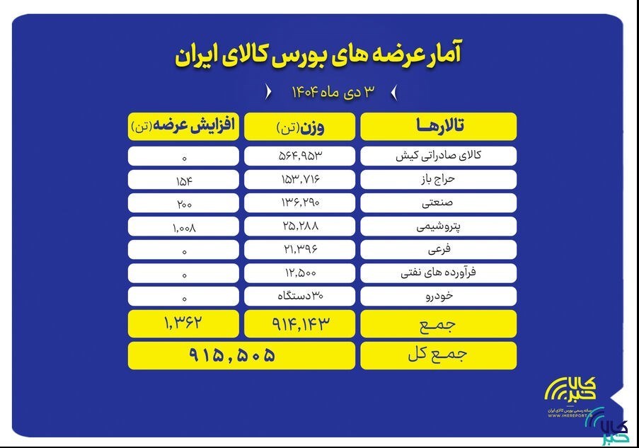 عصر بازار- تالارهای بورس کالای ایران امروز چهارشنبه ۳ دی ماه میزبان عرضه ۹۱۵ هزار و ۵۰۵ تن انواع محصول است.