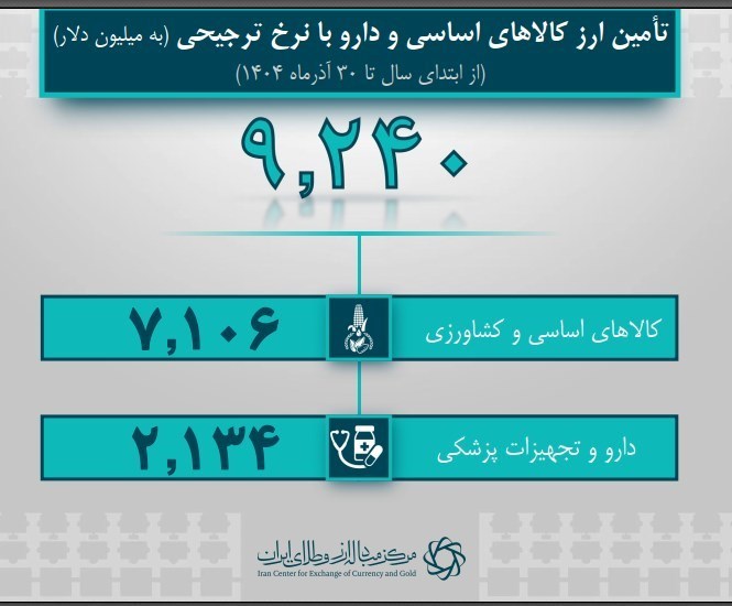 به گزارش پایگاه خبری «عصر بازار» به نقل از روابط عمومی بانک مرکزی، از این میزان، 9 میلیارد و 240 میلیون دلار به واردات کالاهای اساسی و دارو شامل 7 میلیارد و 106 میلیون دلار برای نهادهها و بخش کشاورزی و 2 میلیارد و 134 میلیون دلار برای واردات دارو و تجهیزات پزشکی تخصیص یافته است.