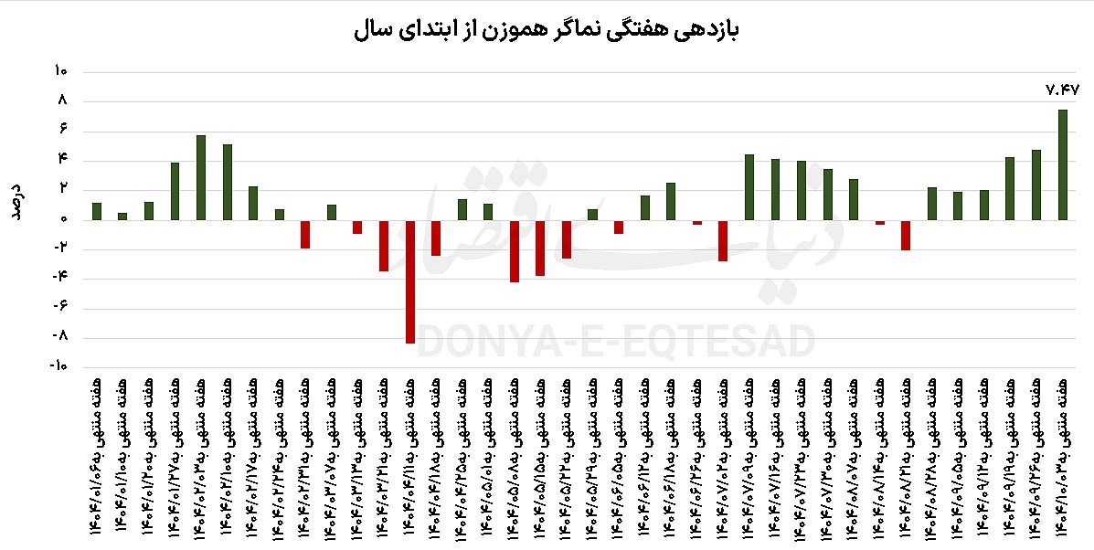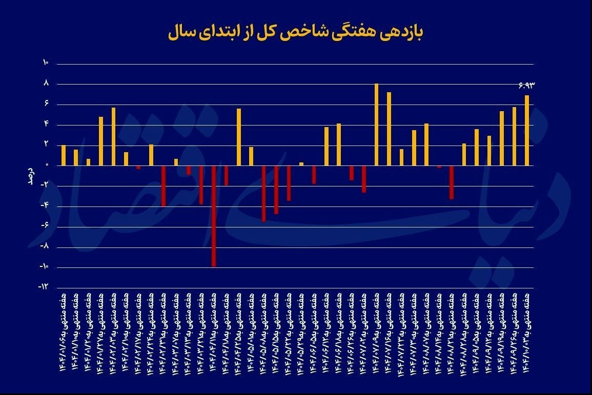 به گزارش پایگاه خبری «عصر بازار» به نقل از دنیای اقتصاد، این رشد در ادامه مسیر صعودی هفته‌های اخیر رخ‌داد و بازدهی مثبت بورس تهران به ششمین هفته متوالی رسیده‌است. شاخص هموزن نیز در هفته مذکور درخشان ظاهر شد و گوی سبقت را از شاخص‌کل ربود. شاخص هموزن با رشد 7.47‌درصدی نشان‌داد؛ تقاضای ایجادشده در تالار شیشه‌ای متاثر از خوش‌بینی‌‌‌‌های جدید از انتظارات مثبت سودآوری در این بازار است و صرفا به نمادهای بزرگ و شاخص‌‌‌‌ساز محدود نبوده‌است. کسب این بازدهی بالاترین میزان رشد شاخص هموزن در 48هفته اخیر به‌شمار می‌رود. در فرابورس هم شاخص‌کل این بازار با رشد 6.45‌درصدی پرقدرت ظاهر شد. به این‌ترتیب بورس با کسب بازدهی 7‌درصدی، بازارهای موازی را پشت‌سر گذاشت. بازگشت اقبال سرمایه‌گذاران حقیقی، تشدید انتظارات تورمی و رشد قیمت دلار از مهم‌ترین محرک‌‌‌‌های بورس در این مسیر بودند. پس از بورس، سکه طلا با ثبت رشد 4.84‌درصد در مقیاس هفتگی در جایگاه دوم ایستاد. رتبه سوم به طلای 18 عیار با کسب بازدهی 4.46‌درصد اختصاص یافت. دلار بازار آزاد نیز که به‌عنوان محرک و پیشران صعود همه بازارها بود در قعر جدول بازدهی بازارهای دارایی ایستاد و  در هفته‌ای که گذشت تنها رشدی 2.59‌درصدی را به‌ثبت رساند. در 6 هفته گذشته، بازار سهام با عبور از سقف‌های تاریخی، توانست مسیر صعودی خود را تثبیت کند و جایگاه خود را به‌عنوان یکی از مهم‌ترین گزینه‌‌‌‌های سرمایه‌گذاری در اقتصاد ایران محکم کند. در نیمه دوم سال‌1404، بازار سهام بارها برتری خود را نسبت به بازارهای موازی به رخ کشیده است؛ به‌طوری‌که ارزیابی عملکرد هفتگی بورس در مدت سپری شده از نیم‌سال دوم 1404 نشان می‌دهد، بازار سهام توانسته است 9‌بار بازدهی بالاتری نسبت به بازارهای موازی همچون ارز، طلا و سکه ثبت کند.
