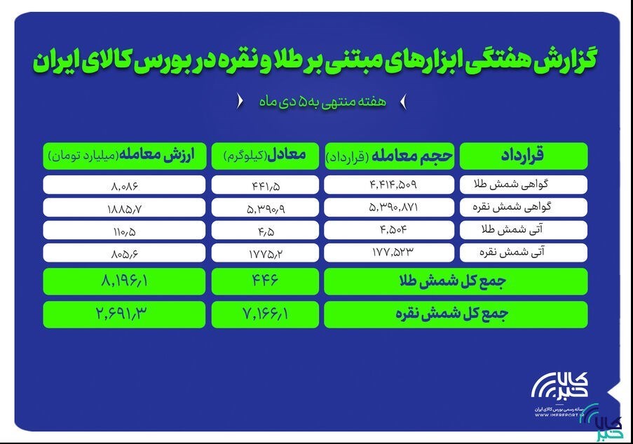 عصر بازار- بررسی عملکرد ابزارهای مبتنی بر طلا و نقره در بورس کالای ایران نشان میدهد که در هفته گذشته ۷ تن و ۱۶۶ کیلوگرم شمش نقره و ۴۴۶ کیلوگرم شمش طلا در بازار گواهی سپرده و آتی معامله شد.