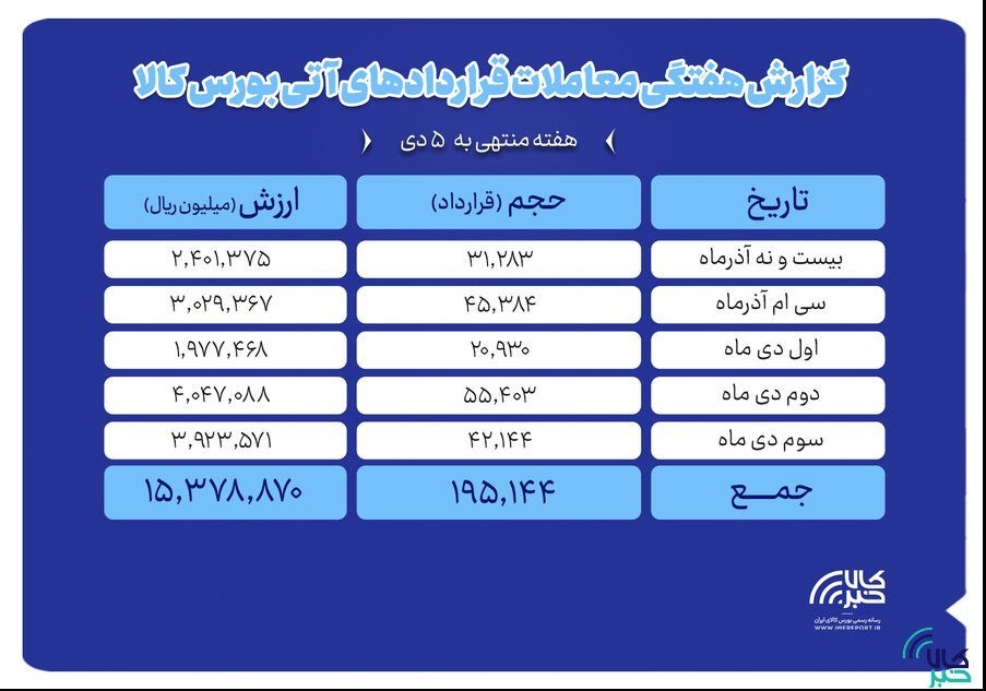 به گزارش پایگاه خبری «عصر بازار» به نقل از کالاخبر،در هفته گذشته 195هزار و 144 قرارداد آتی به ارزش هزار و 537 میلیارد تومان منعقد شد. بیشترین حجم و ارزش معاملات نیز به روز دوم دی ماه اختصاص یافت به طوری که در این روز 55 هزار و 403 قرارداد به ارزش بیش از 404 میلیارد تومان منعقد شد.