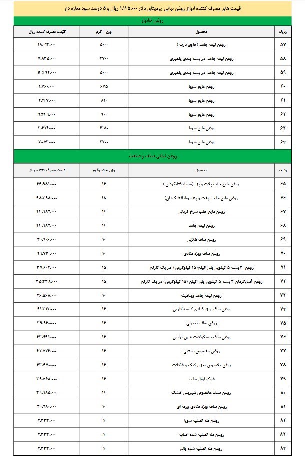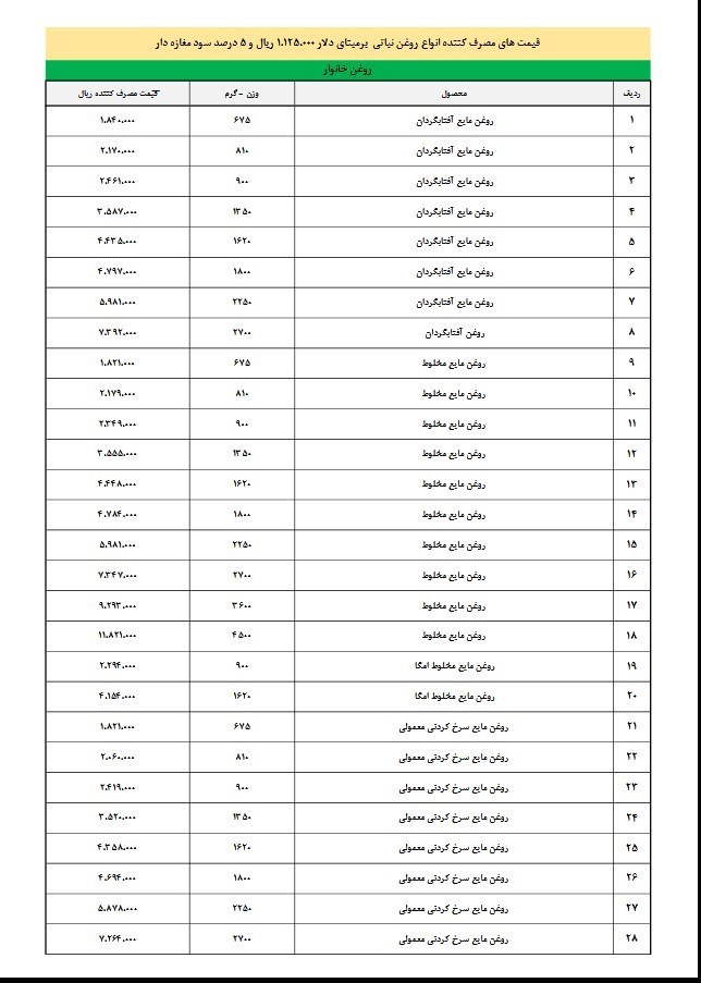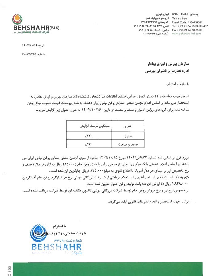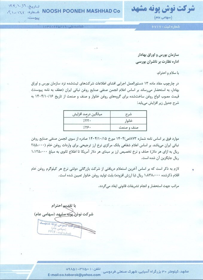 بر اساس اطلاعیه افشای اطلاعات بااهمیت گروه الف، شرکت نوش پونه مشهد با نماد« غپونه»، هم خبر داد بر اساس اعلام انجمن صنفی صنایع روغن نباتی ایران (عطف به نامه پیوست)، قیمت مصوب انواع روغن ساخت‌شده برای گروه‌های روغن خانوار و صنف و صنعت از تاریخ 16/10/1404 افزایش می‌یابد.