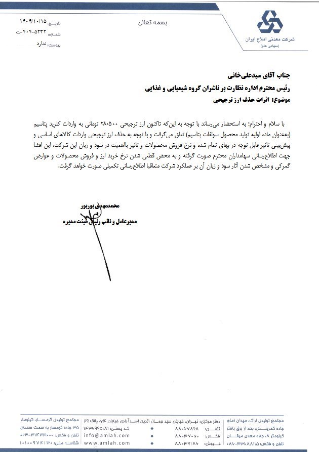 بر اساس اطلاعیه افشای اطلاعات بااهمیت گروه ب، شرکت معدنی املاح ایران با نماد« شاملا» هم خبر داد با توجه به این‌که تاکنون ارز ترجیحی 28،500 تومانی به واردات کلرید پتاسیم (به‌عنوان ماده اولیه تولید محصول سولفات پتاسیم) تعلق می‌گرفت و با توجه به حذف ارز ترجیحی واردات کالاهای اساسی و پیش‌بینی تاثیر قابل توجه در بهای تمام شده و نرخ فروش محصولات و تاثیر بااهمیت در سود و زیان این شرکت، به محض قطعی شدن نرخ خرید ارز و فروش محصولات و عوارض گمرکی و مشخص شدن آثار سود و زیان آن بر عملکرد شرکت متعاقبا اطلاع‌رسانی تکمیلی صورت خواهد گرفت.