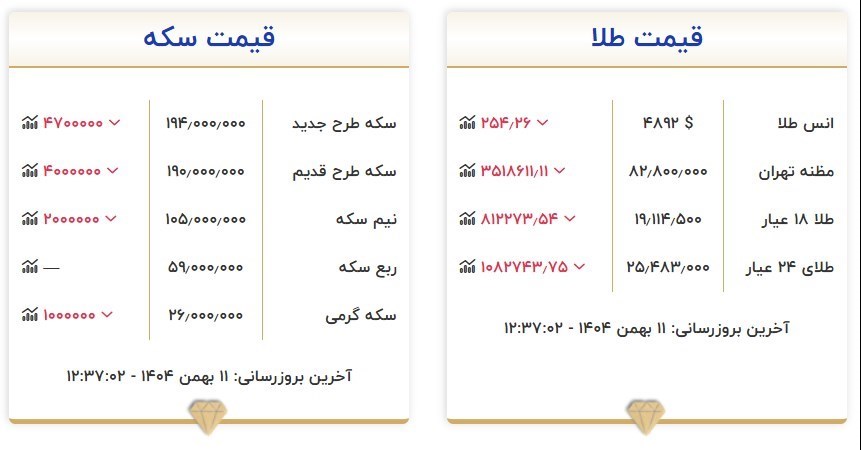 امروز - شنبه 11 بهمن - با توجه به تعطیلی بازارهای جهانی، قیمت هر اونس طلا در محدود 4 هزار و 892 دلار قرار دارد و بر این اساس قیمت هر گرم طلای 18 عیار در بازار تهران 19 میلیون و 114 هزار و 500 تومان و هر گرم طلای 24 عیار 25 میلیون و 483 هزار تومان فروخته می شود.