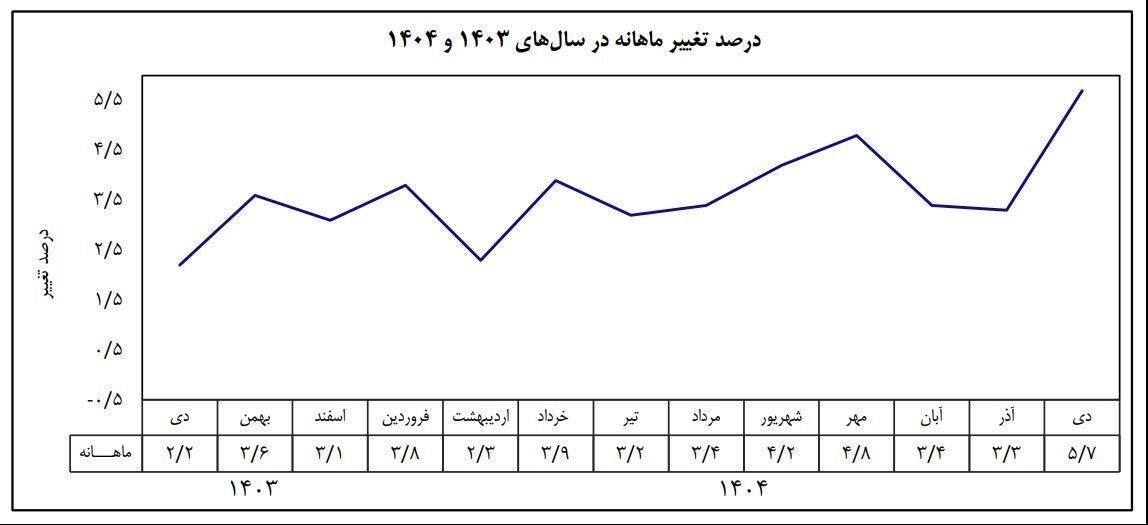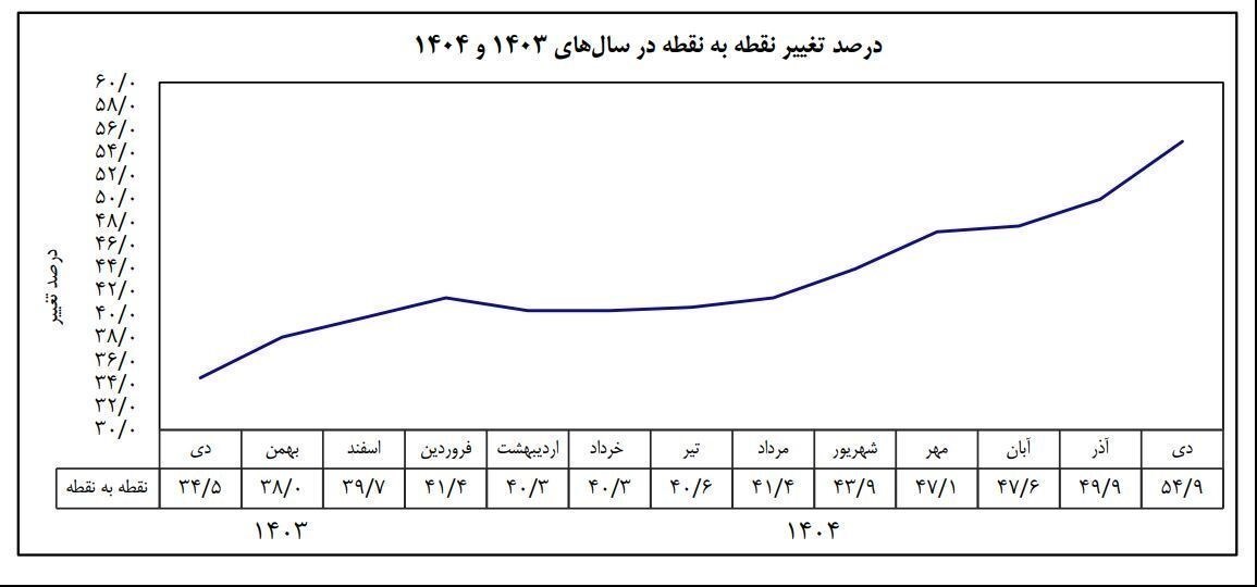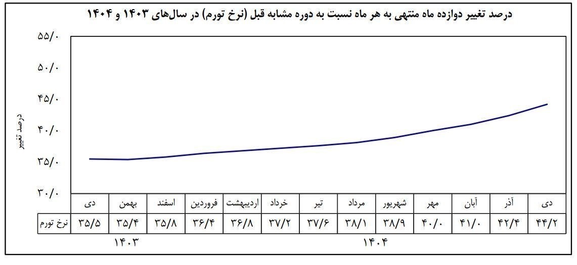 میزان تورم در دوازده ماه منتهی به دی ماه 1404 نیز نسبت به دوازده ماه منتهی به دی ماه 1403 معادل 44.2 درصد است.
