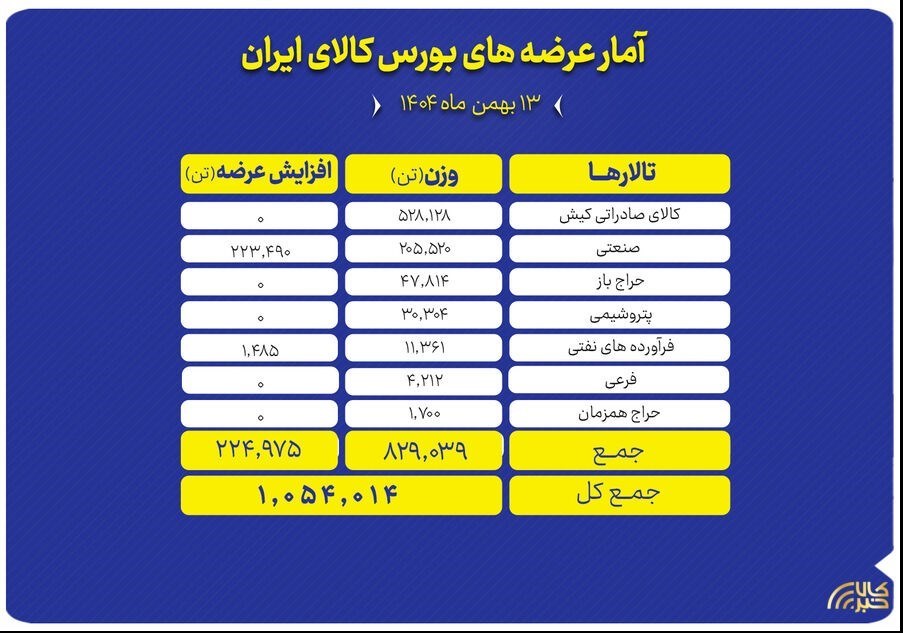 عصر بازار- تالارهای بورس کالای ایران امروز دوشنبه ۱۳ بهمن ماه میزبان عرضه یک میلیون و ۵۴ هزار و ۱۴ تن انواع محصول است.