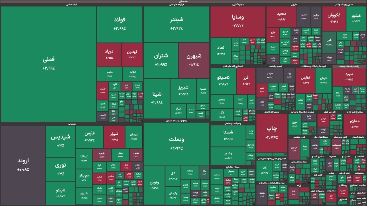 79 درصد بازار سبزپوش و 560 نماد مثبت و 21 درصد بازار سرخ پوش و 167 نماد منفی بود. ارزش صف خرید 1447 میلیارد تومان و فروش 640.6 میلیارد تومان بود.