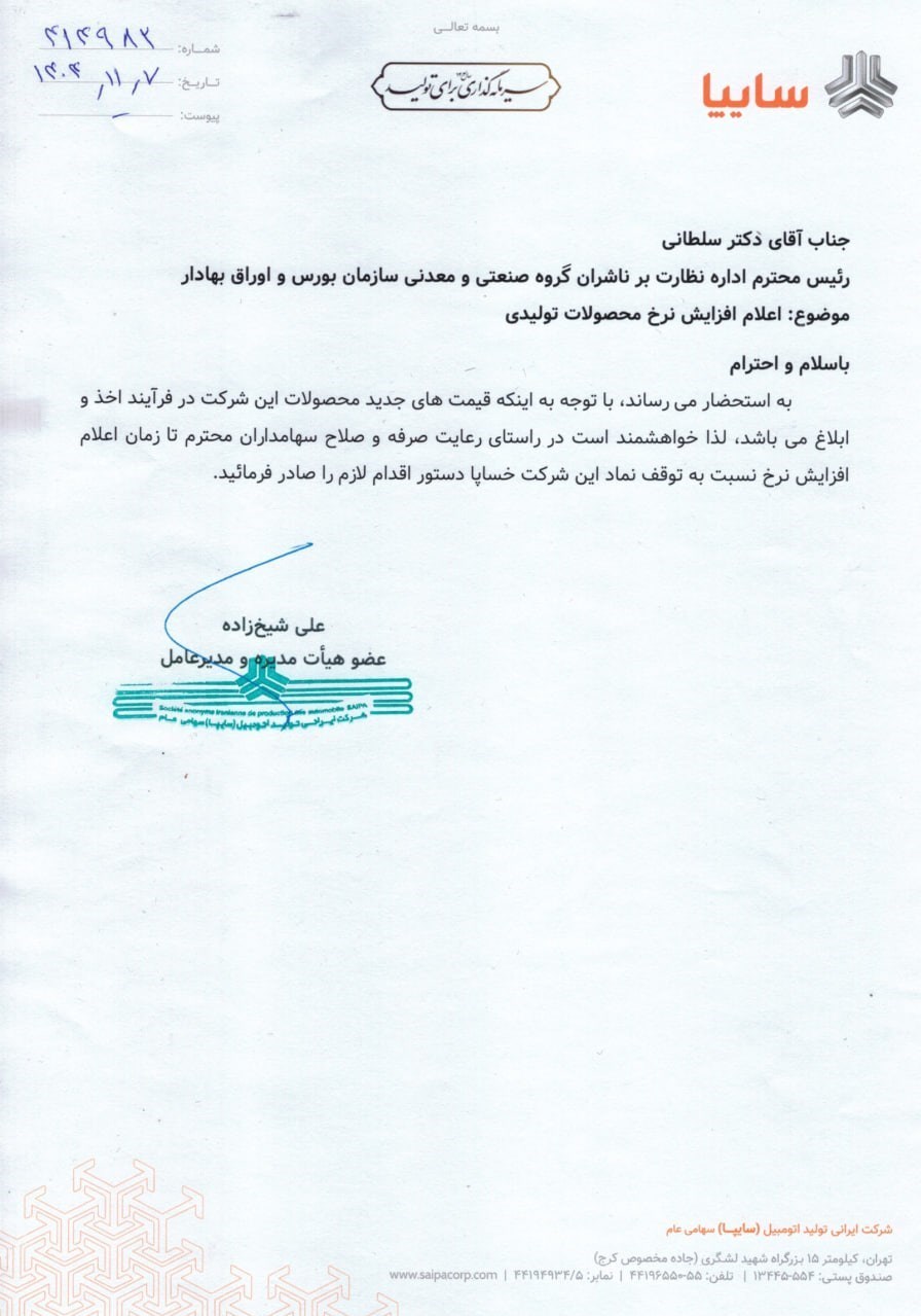 سایپا در نامه‌ای به رئیس اداره نظارت بر ناشران گروه صنعت و معدن سازمان بورس از فرآیند افزایش و ابلاغ قیمت محصولات این شرکت خبر داده؛ لذا نماد این شرکت (خساپا) در بورس تا زمان ابلاغ قیمت‌های جدید محصولات این شرکت و با هدف حفظ منافع سهامداران تا 18 بهمن تعلیق شده است.