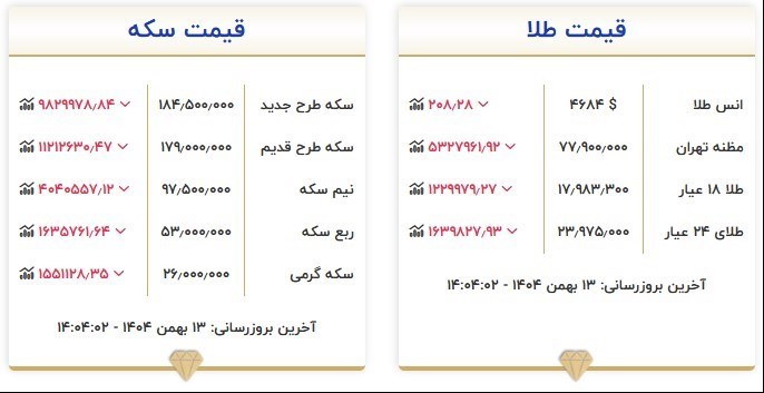 در بازار مسکوکات طلا نیز سکه طرح جدید 184 میلیون و 500 هزار تومان قیمت خورد که نسبت به دیروز 9 میلیون و 829 هزار تومان کاهش دارد؛ سکه طرح قدیم نیز با کاهش 11 میلیون و 212 هزار تومان 179 میلیون تومان قیمت گذاری شده است.