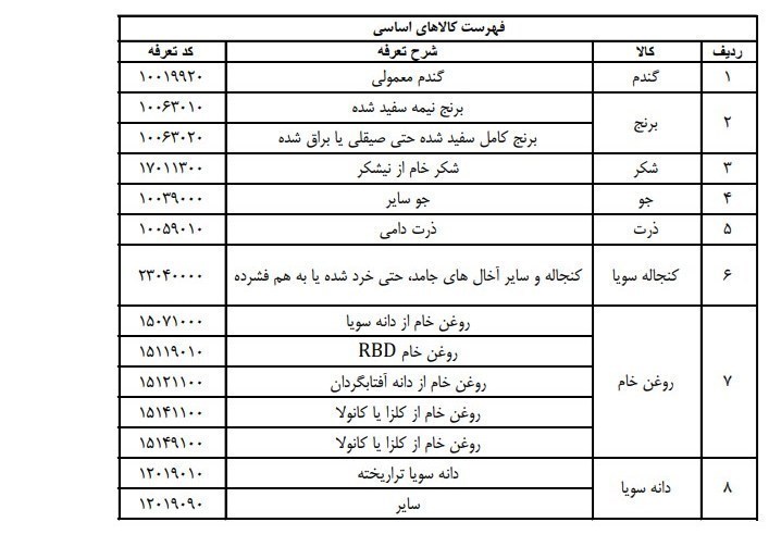عصر بازار- فهرست کد تعرفههای کالاهای اساسی مشمول بسته حمایت از صنایع ابلاغ شد.