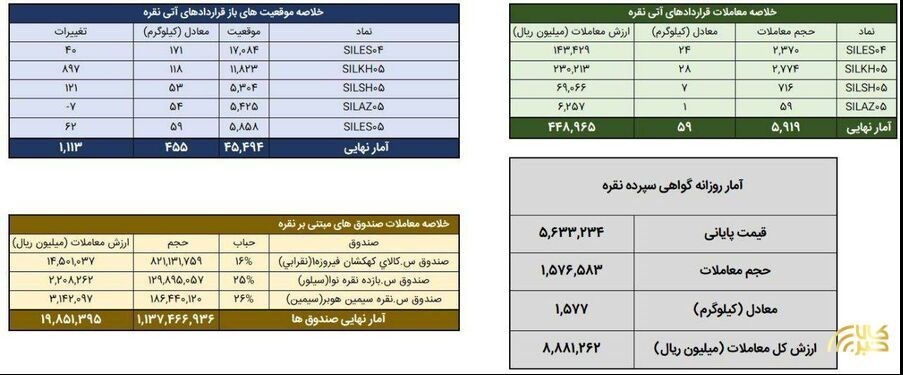 در صندوق های مبتنی بر نقره نیز حجم معاملات از یک میلیارد و 137 میلیون و 467 هزار واحد عبور کرد و ارزش معاملات در مجموع به بیش از 1985 میلیارد تومان رسید.