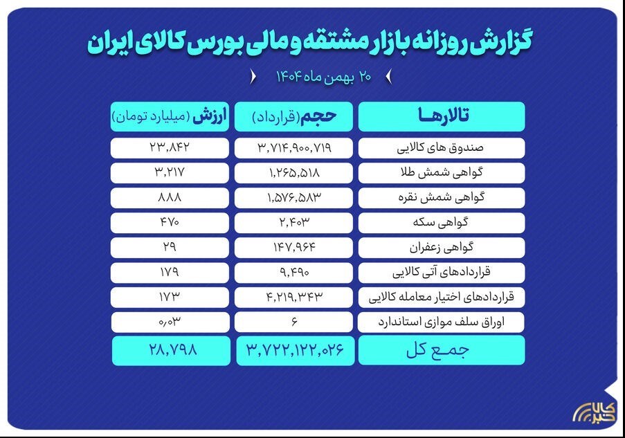 عصر بازار- روز گذشته در بازار مشتقه و مالی بورس کالای ایران بالغ بر ۳ میلیارد و ۷۷۲میلیون قرارداد به ارزش ۲۸.۸ هزار میلیارد تومان منعقد شد.