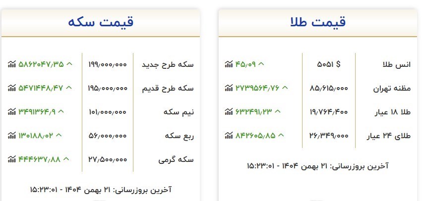 همچنین در بازار سکه، قیمت سکه تمام 199 میلیون تومان و سکه طرح قدیم 195 میلیون تومان به فروش رفت که به ترتیب 5 میلیون و 862 هزار تومان و همچنین 5 میلیون و 471 هزار تومان افزایش قیمت داشته اند؛ نیم سکه نیز با افزایش 3 میلیون و 491 هزار تومانی به 101 میلیون تومان رسید.
