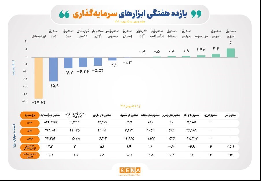 عصر بازار- طبق دادههای آماری مرکز نظارت بر صندوقهای سرمایهگذاری سازمان بورس و اوراق بهادار، در بازه زمانی ۹ تا ۱۵ بهمن ۱۴۰۴ بازده ۶ ابزار سرمایهگذاری بورس مثبت بود.