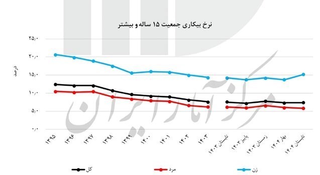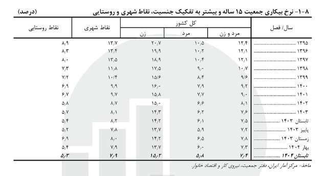 براساس این گزارش در تابستان 1403 نرخ بیکاری 7.5 درصد و در پاییز 1403 معادل 7.2 درصد و در زمستان 1403، 7.8 درصد بوده است.