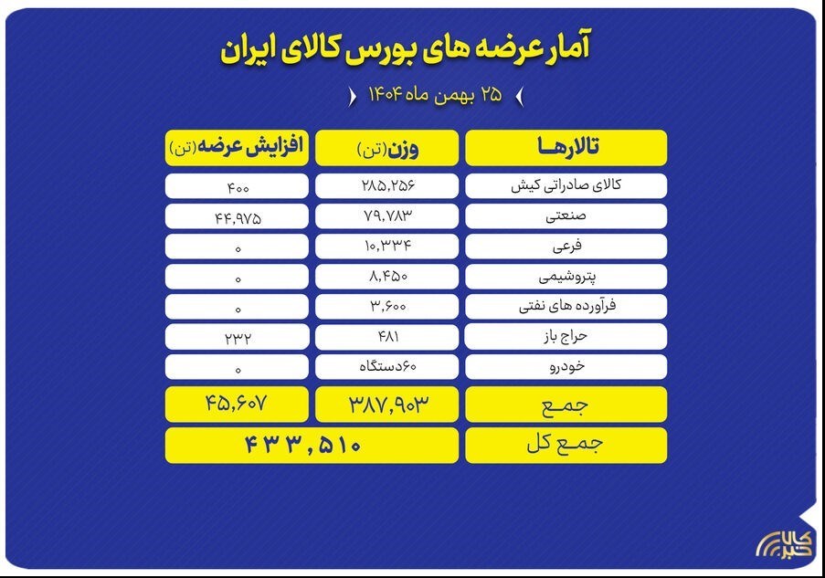 عصر بازار- تالارهای بورس کالای ایران در روز شنبه ۲۵ بهمن ماه میزبان عرضه ۴۳۳ هزار و ۵۱۰ تن انواع محصول هستند.