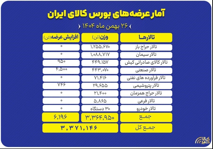عصر بازار- تالارهای بورس کالای ایران امروز یکشنبه ۲۶ بهمن ماه میزبان عرضه ۳ میلیون و ۳۷۱ هزار و ۱۴۶ تن انواع محصول است.