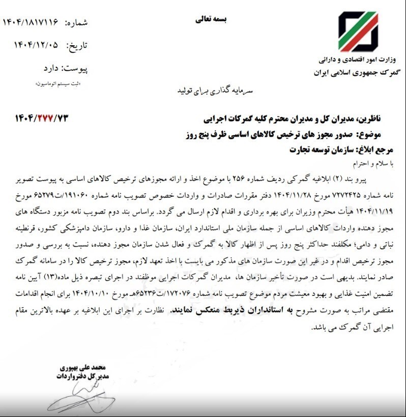 بر اساس این بخشنامه که سازمان توسعه تجارت ایران مطابق تصویبنامه 19 بهمن 1404 هیئت وزیران و با عنوان آییننامه تضمین امنیت غذایی و بهبود معیشت مردم به گمرک ایران ابلاغ کرده، دستگاههای مجوز دهنده واردات کالاهای اساسی از جمله سازمان ملی استاندارد ایران، سازمان غذا و دارو، سازمان دامپزشکی کشور، قرنطینه نباتی و دامی مکلفند حداکثر 5 روز پس از اظهار کالا به گمرک و فعال شدن سازمان مجوزدهنده، برای بررسی و صدور مجوز ترخیص اقدام کنند.