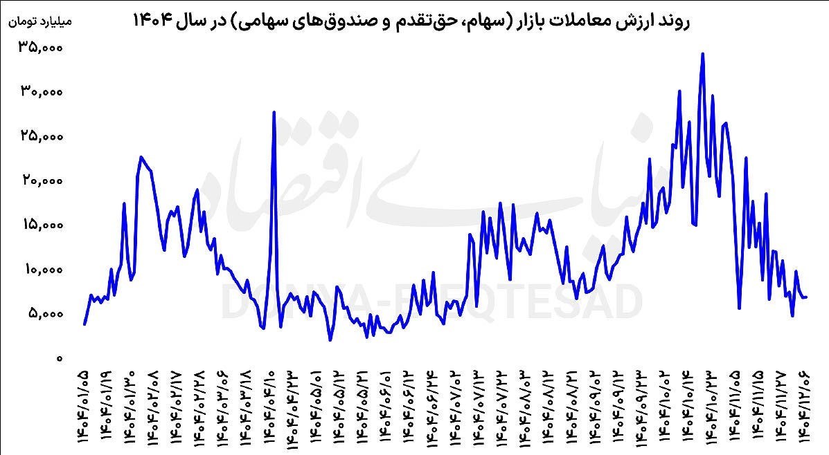 همزمان با افت ریالی ارزش معاملات، سنجه دلاری این متغیر نیز کاهش پررنگتری را نشان میدهد. در نیمه دوم سال و با تضعیف ارزش پول ملی و رشد قیمت دلار در بازار آزاد، مقایسه اسمی ارقام ریالی تصویر دقیقی از شدت رکود ارائه نمیکند. زمانی که ارزش معاملات به دلار محاسبه میشود، عمق واقعی افت مشارکت سرمایهگذاران آشکارتر میشود.
